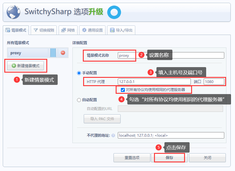 ① HTTP代理:新建情景模式,设置情景模式名称,选择“手动配置”,在“HTTP代理”一栏中填入主机号及端口号,然后勾选“对所有协议均使用相同的代理服务器”,保存完成设置。